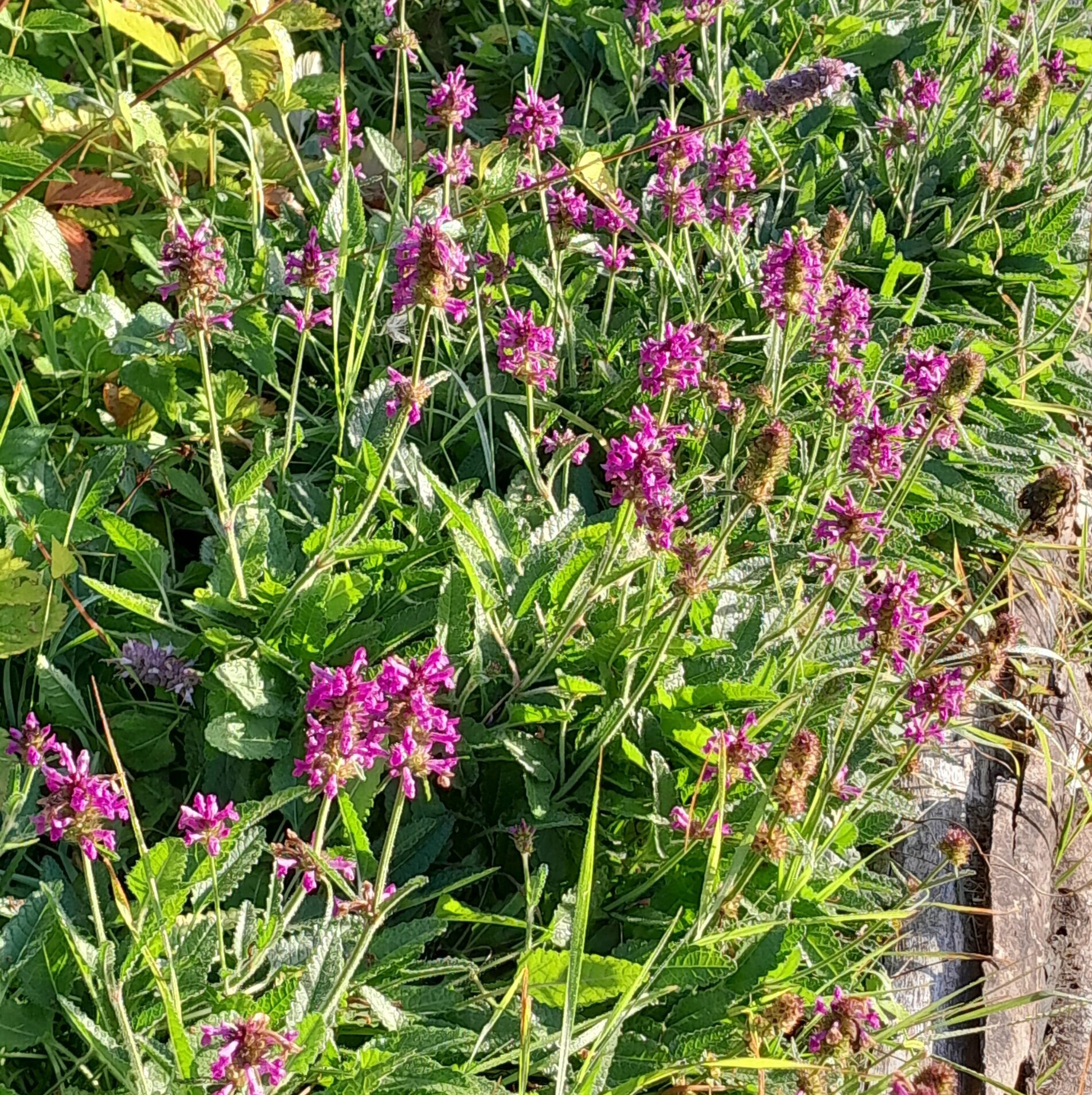 Also known as Common Hedgenettle, Purple Betony, Wood Betony, Bishopwort, or Bishop’s Wort, this perennial herb is native to Britain. It is a hardy herb of grasslands and hedgerows, with a basal rosette of wrinkled leaves forming a low ground cover. These can spread on rhizomes to form a mat but are not invasive. In summer leaf stems rise and are then topped by pinky-purple flower spires to a height of about 40cm. Like other members of the mint family, it has square stems and lipped flowers, which are an excellent attractor of bees and other pollinators.