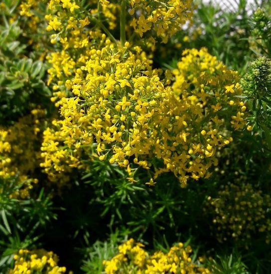 Hardy perennial spreading ground cover. The leaves are edible raw or cooked, and chopped up leaves can be used as a rennet to coagulate plant milks. Lady’s Bedstraw is related to madder and yields similar dyes, red from the roots, and yellow from the flowers. The yellow can be used as a food colouring, and gives its colour to the cheese Double Gloucester. The flowers can be steeped to make a refreshing drink, and the plant is also used to infuse spirits such as the Danish drink Bjæsk. The seeds are also said to be edible.