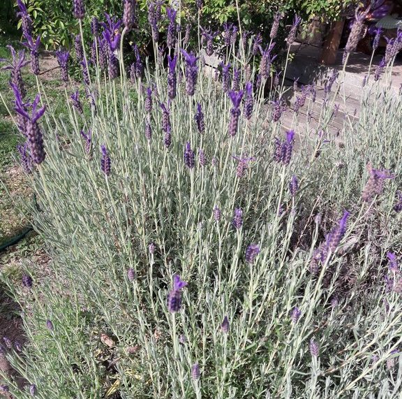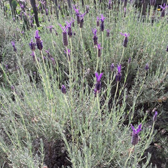 Aromatic grey foliage with gorgeous pink to purple strongly scented flowers, which appear in late spring and early summer on 2 cm long spikes at the top of slender, leafless stems 10–30 cm long. We find that when this is in flower the bees prefer it over the Lavender dentata, but it has a much shorter flowering season. It does best in Mediterranean climates similar to its native habitat, characterised by wet winters and dry summers. Sandy soil preferred but does fine on clay as long as it is well drained. Full sun. Frost hardy to -10. Fire resistant species. Spread 70cm x height – 80cm – 100cm.