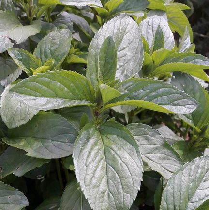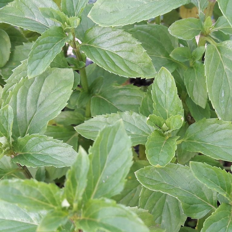 Upright mint with rounded, thick, dark green foliage with a reddish-purple tinge, and red stems and leaf veins. It has the scent and flavour of basil.  In summer, small pink or white flowers are produced. Height to 50cm.  Perennial.