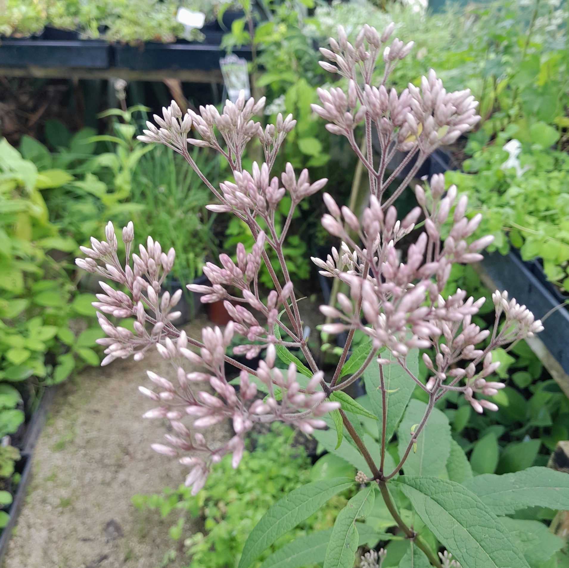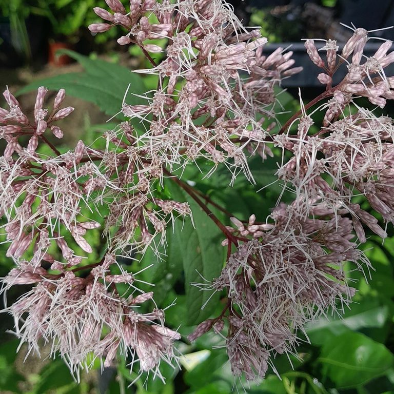 Tall erect herbaceous perennial to 1.5m, also known as Queen of the Meadow and Gravel Root. Large domed clusters of nectar and pollen-rich purple flowers from mid summer to mid autumn, which attract bees, butterflies and moths. Great for the back of a border in a naturalistic setting, and goes well with echinacea and rudbeckia.