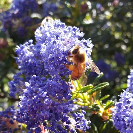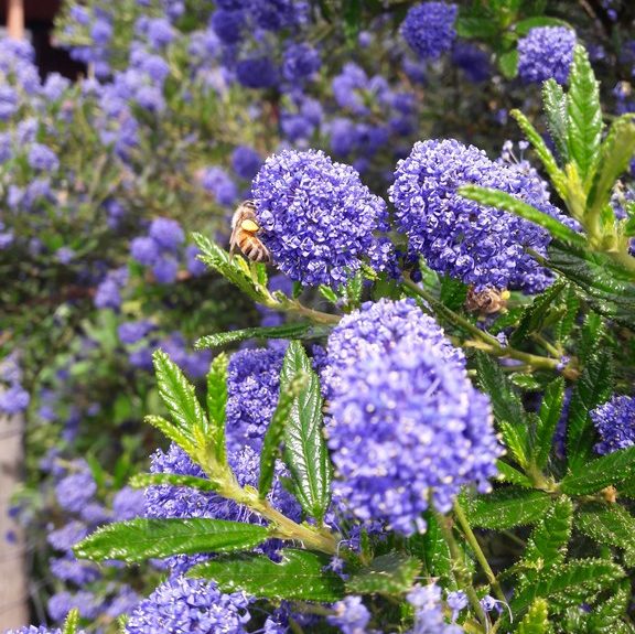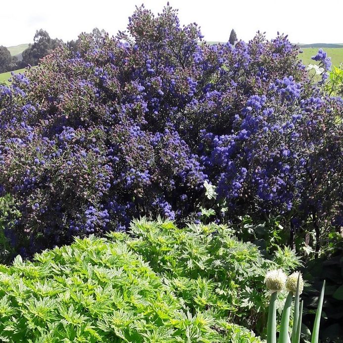 The largest of our range of California Lilacs.  Frost and drought hardy evergreen nitrogen fixing shrub providing a stunning show of blue flowers in spring which attracts bees by the hive-load! Ht 2.5m x 2.5m.
